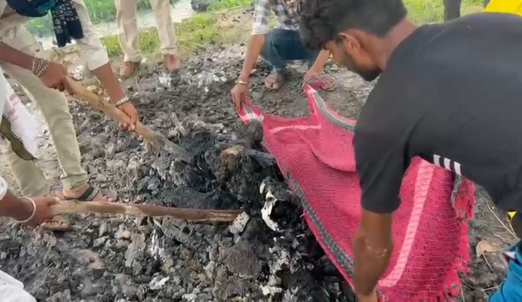 राजगढ़ जिले के कालीपीठ थाना क्षेत्र के टांडी खुर्द गांव में हत्या कर शव जलाने की सूचना पर मृत महिला के परिजनों ने पुलिस के साथ शमशान में पहुंचकर जलती चिता को बुझाकर, महिला का अधजला शव बाहर लिया ।