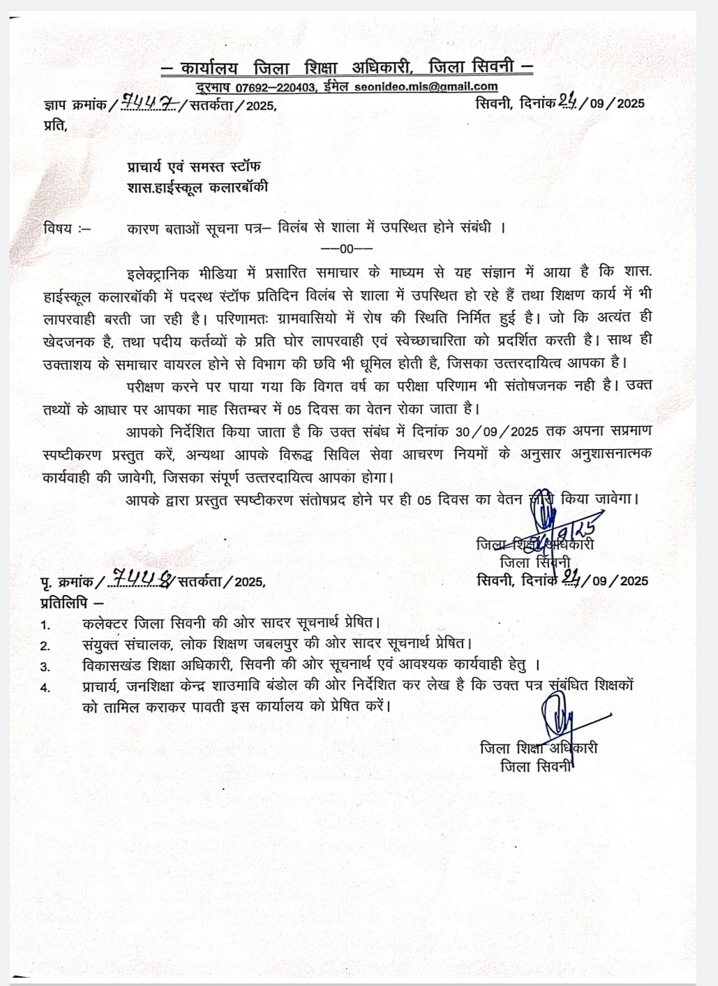 जिले के शासकीय हाईस्कूल कलारबांकी के प्रधानाध्यापक एवं समस्त स्टाफ को विद्यालय में अनुपस्थित रहने और शिक्षण कार्य में लापरवाही बरतने पर जिला शिक्षा अधिकारी सिवनी द्वारा कारण बताओ सूचना पत्र जारी किया गया है।